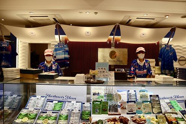 「横濱ハーバー」をはじめ、ストーリーのあるギフト菓子や、華やかなスイーツが店内に並ぶ店内は「ハーバーズムーン」のロゴをあしらい、ブルーとホワイトの爽やかなコントラストと帆船の帆をイメージした内装に仕上げ、港町横浜を感じていただけるようにしました。