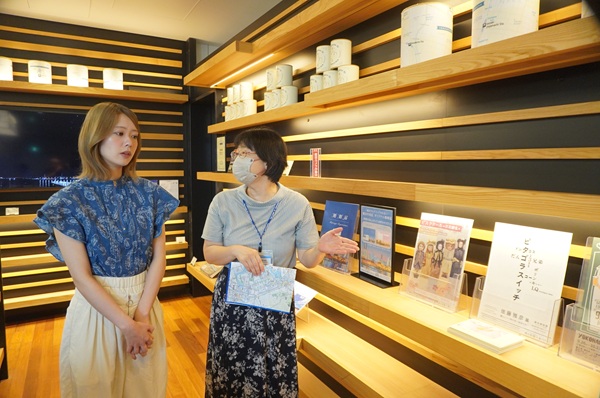 横浜に関する書籍(閲覧可能)もあり、外国のホテルのラウンジのようです。モバイルバッテリーのスタンドも設置。Wi-Fiも完備しています。(レイアウトや展示物は今後変更することもあります。)