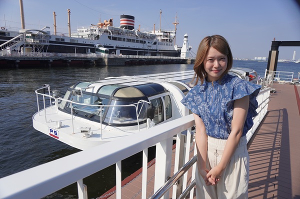 横浜ハンマーヘッドのホテル側の正面にある、新港さん橋「ハンマーヘッドのりば」からシーバスで山下公園まで10分の海の旅に出発です。この乗船チケットは、アットヨコハマでワンデーパスポートを買うこともできます。
