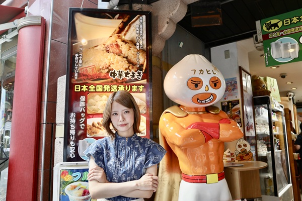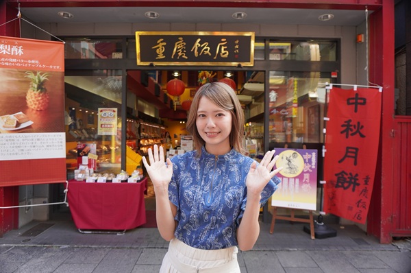 老舗、重慶飯店の売店前でポーズ。