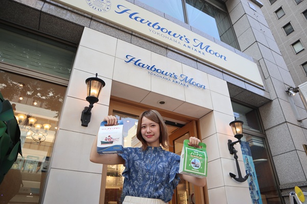 「横濱ハーバー」をはじめ、ストーリーのあるギフト菓子や、華やかなスイーツが店内に並ぶ店内は「ハーバーズムーン」のロゴをあしらい、ブルーとホワイトの爽やかなコントラストと帆船の帆をイメージした内装に仕上げ、港町横浜を感じていただけるようにしました。