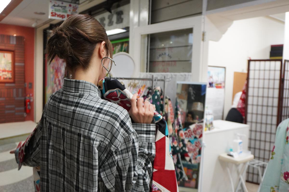 日本大通り駅から徒歩3分。シルクセンターM1階にある「横濱ハイカラきもの館 」でまずは袴に着替えていきます。お店に着くと店頭にたくさんの着物が!お気に入りのものを選んでいきます。