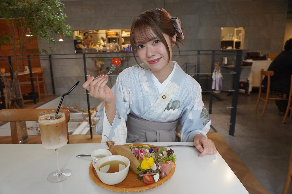 記念撮影が終わったらご飯を食べに行きます。1階がフラワーショップ、2階がカフェレストランとなっており、花や緑を感じる空間で、ちょっとしたランチやティータイムを楽しむことができます。「花フォトリップ」では、メインが選べるプリフィックスランチがセットになっています。今日は一番人気のブーケ仕立てのサラダを選びました。