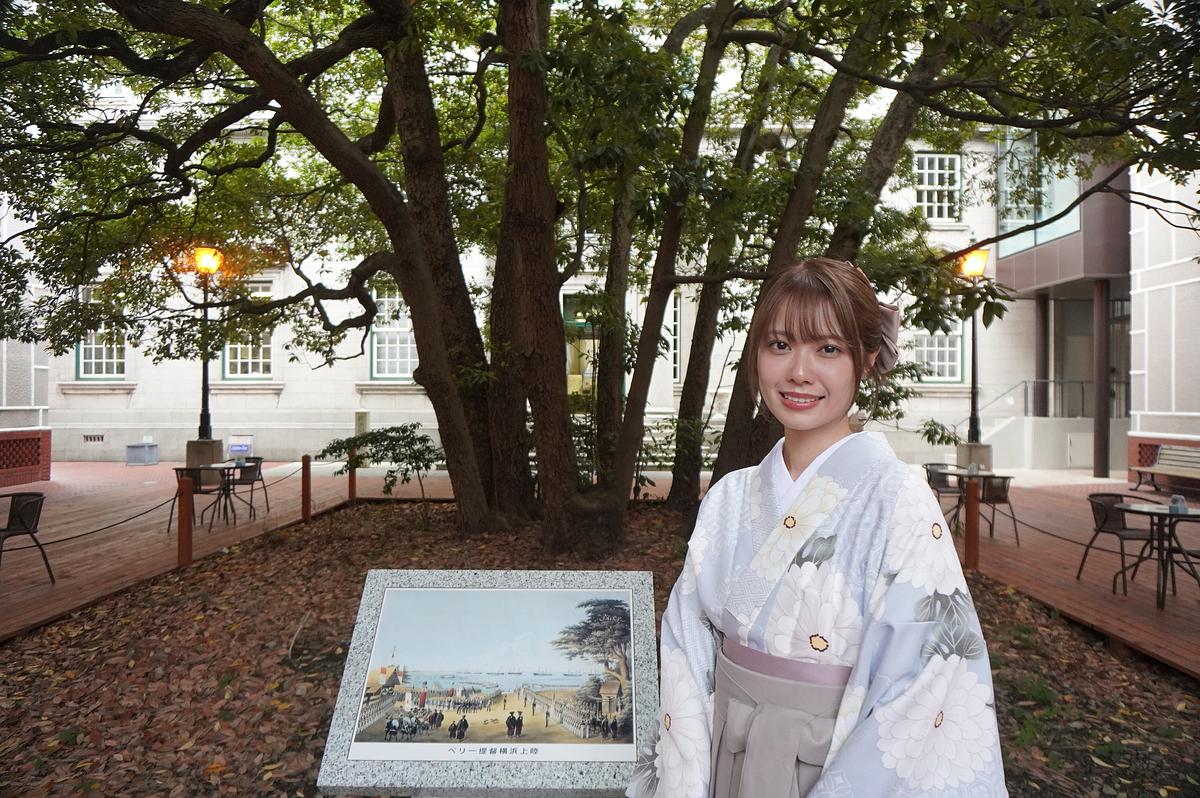 横浜開港資料館の中庭にあるタブノキ、通称「たまくすの木」の前で記念撮影。