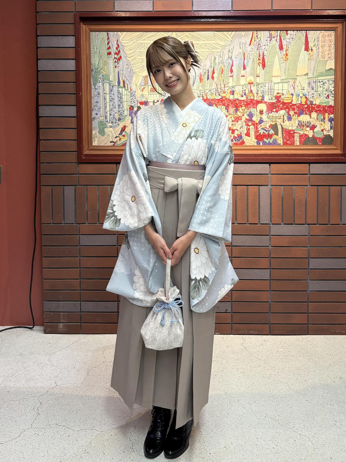 袴もたくさん種類があります!定番カラーから流行りのくすみカラーまで。組み合わせ無限大です。今回は水色の着物に合わせて淡めなブラウンで⸜❤︎⸝