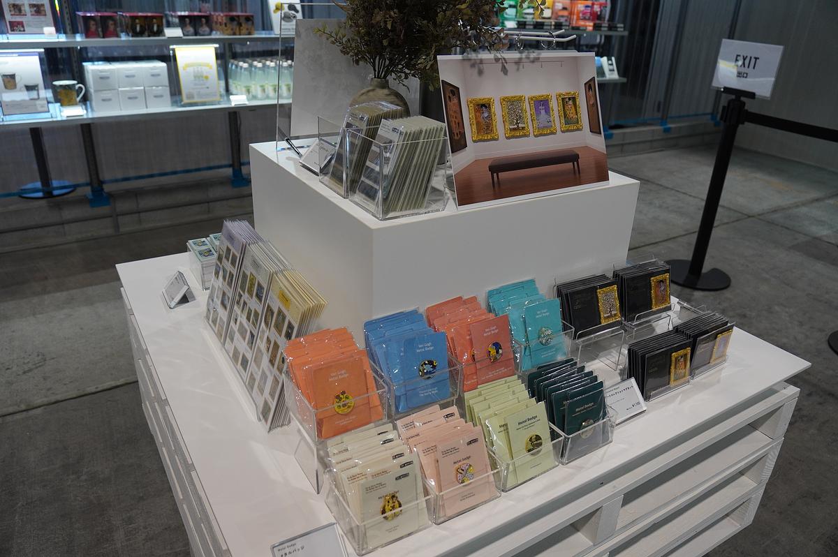 オリジナルTシャツやピンバッジ、ステッカーなど、デザイン性の高いアイテムが並んでいます。