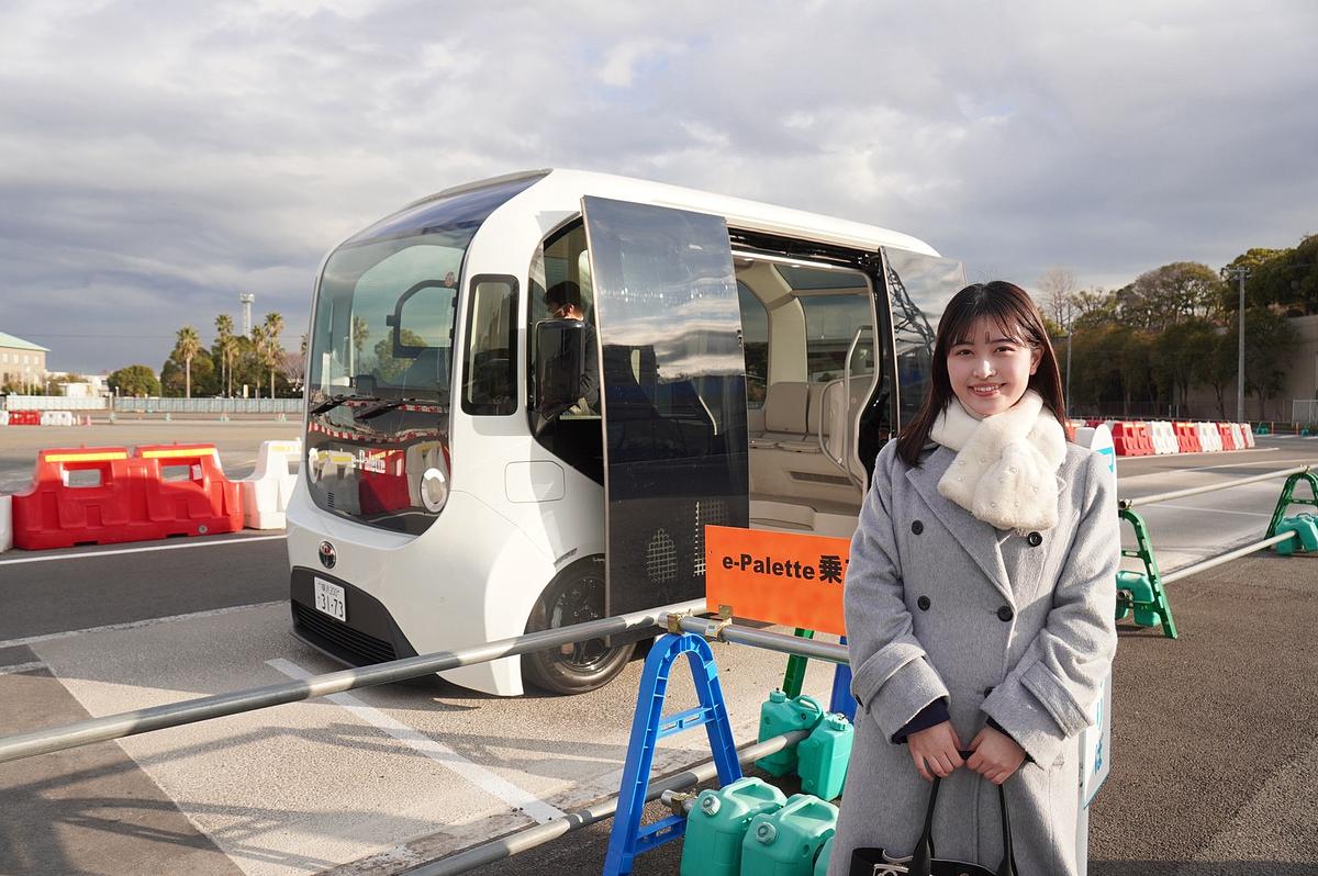 会場までは、トヨタの未来型モビリティ「e-Palette(イーパレット)」が無料で送迎してくれます。丸みを帯びた近未来的なフォルムがとても可愛らしく、これから始まる体験への期待が高まります。