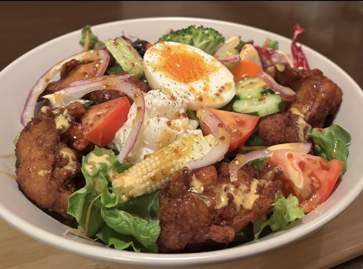 スパイシーチキンサラダライスも、色々なお野菜とチキン、そして雑穀米が使われていて、とても健康的!3種類の手作りドレッシングもこだわりの1つ!