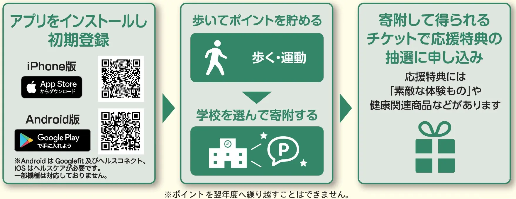 参加者は、歩いてアプリ内で貯めたポイントを応援したい川崎市立の小・中学校(特別支援学校を含む)から選んで寄附します。さらに、寄附したポイントに応じて付与されるチケットで、川崎フロンターレや川崎ブレイブサンダース、協賛企業等からの応援特典の抽選に応募することができます。また、学校では寄附されたポイント数に応じた応援金を市から受け取り、子ども達の学校生活を充実させるために活用します。