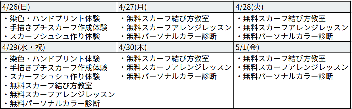 ご自身のスカーフを使ったスカーフアレンジ教室(無料)や、パーソナルカラー診断(無料)。